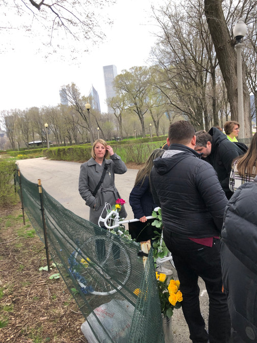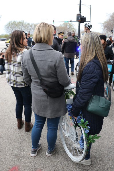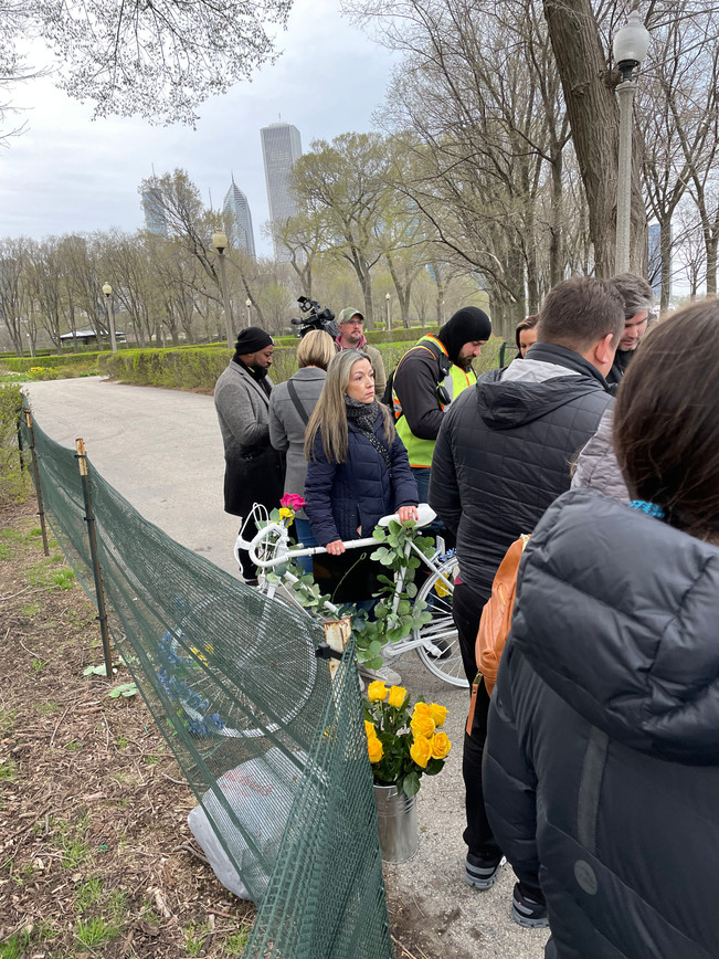 In Chicago I cross several ghost bikes weekly that are familiar fixtures to me, and I remember others that are gone now. I regularly biked past Jacqueline Marie Michon's downtown on Wabash near Wacker until the city removed it. The sign on Liza Whitacre’s ghost bike on Damen Avenue always catches my eye. I remember reading about the death of Anastasia Kondrasheva and seeing her ghost bike not long after. I keep a list of Chicago bikers whose final spots I have visited either alone or as part of a memorial event. Carla Aiello, Isaac Martinez, Adé Hogue, Jose Velásquez, Gerardo Marciales, and Nick Parlingayan most recently for me